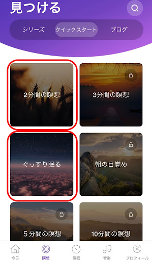 シリーズの中の「はじめての瞑想」「瞑想の基本」 クイックスタートの「2分間の瞑想」「ぐっすり眠る」